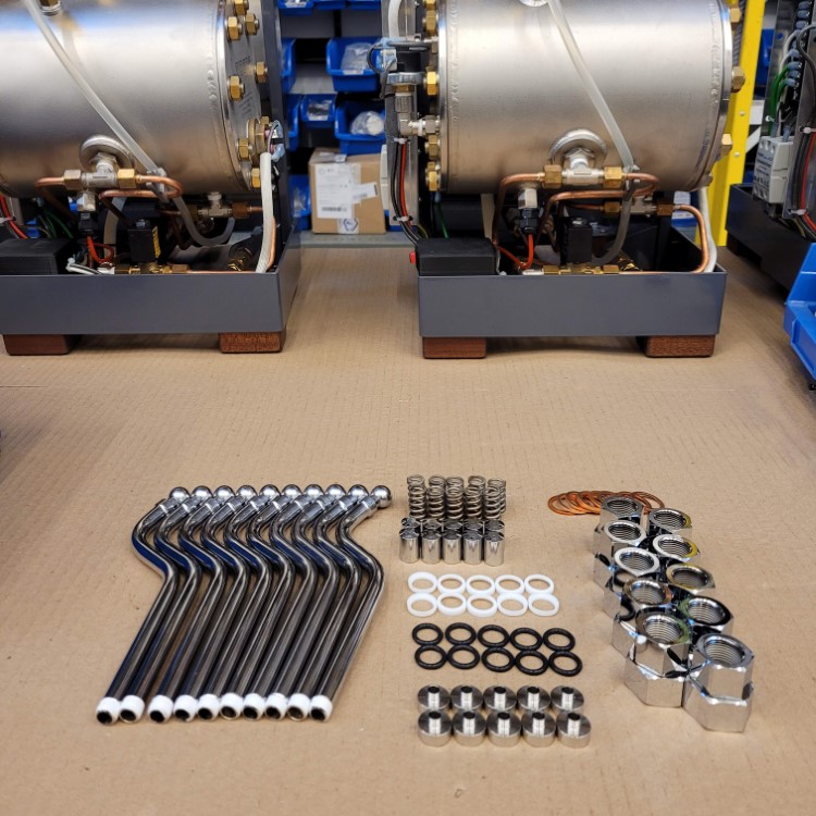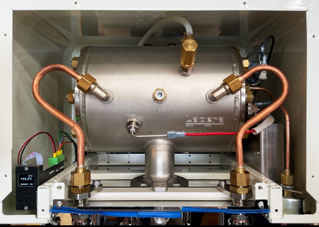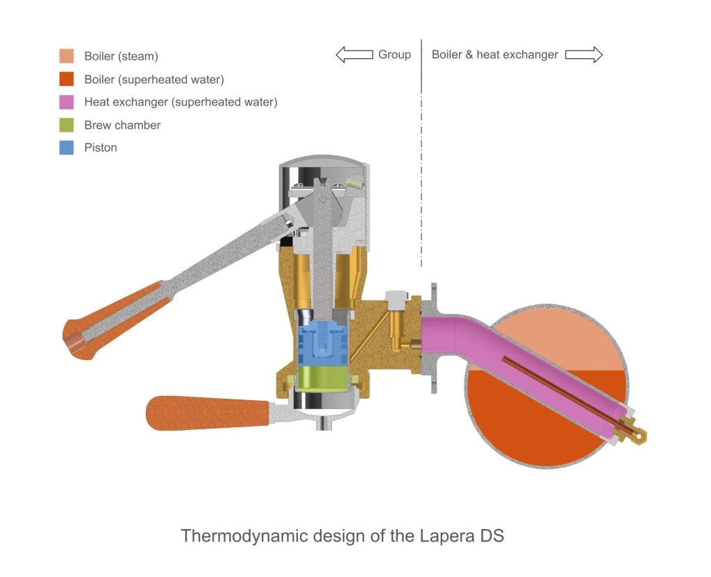 The Lapera DS consists of a single superheated boiler with an external spring lever group that is supplied with water and heat from a heat exchanger that passes through the boiler. The boiler temperature is controlled by a PID algorithm with input from a thermocouple housed in a thermowell inside the boiler. The lever group is physically attached to the heat exchanger and is heated by conduction. During a brew or extraction cycle, water at close to ambient temperature is mixed with the superheated water in the heat exchanger before passing through the internal channels inside the group to the brew chamber.