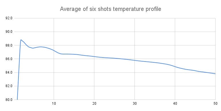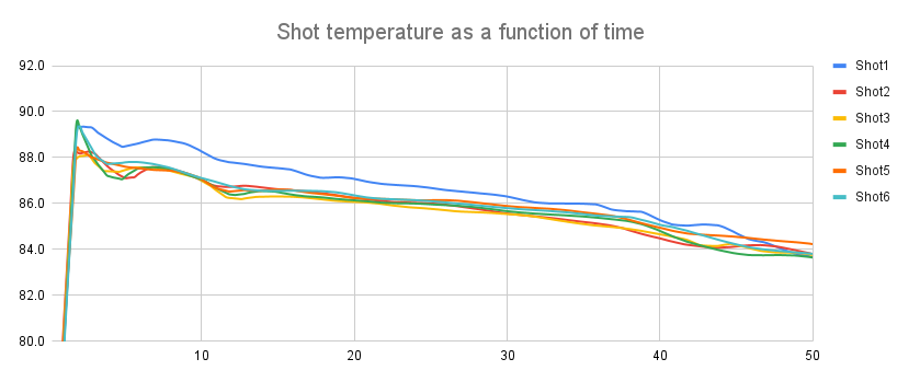 The graph below shows the temperature profiles at the puck during a 50 second shot (averaged from 6 Pulls) at 5 Setpoints that encompass the generally accepted range of brew temperatures for espresso.