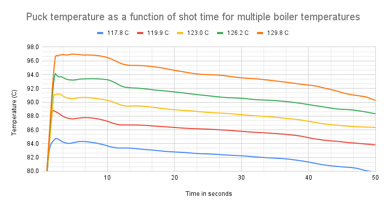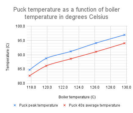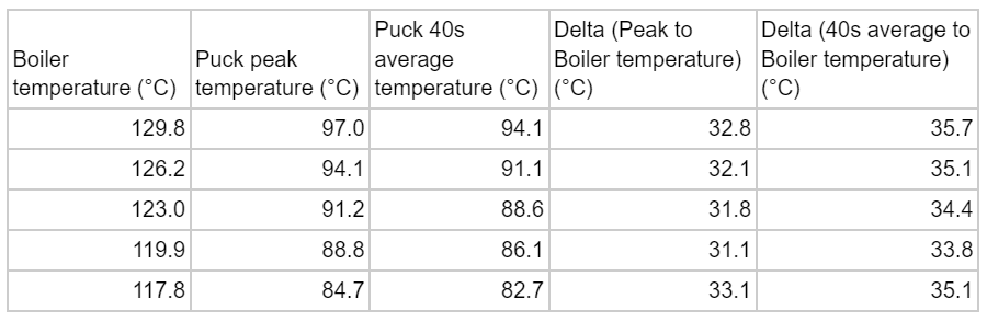 The process was repeated at multiple boiler Setpoints in order to characterize the relationship over the entire espresso brew temperature window. The window used for this experiment was from 85°C to 97°C. Expanding the experiment beyond the generally accepted range of 93°C +/-3 will show whether the relationship between boiler temperature and puck temperature can be approximated as linear within this range or whether the theoretical increase in heat losses at higher temperatures must be taken into account.