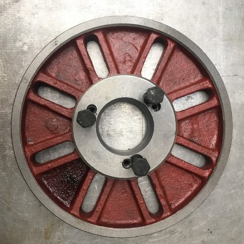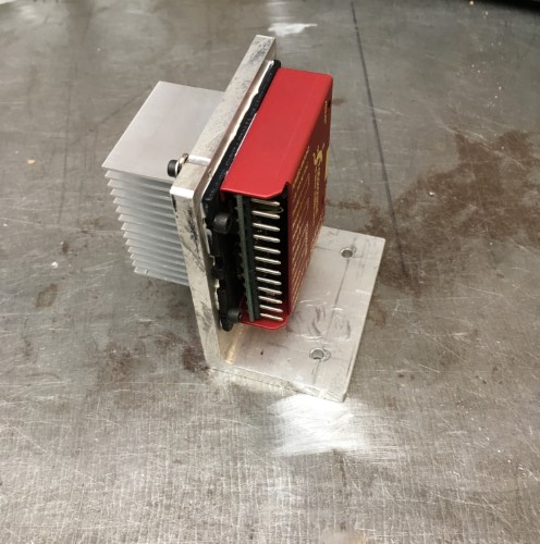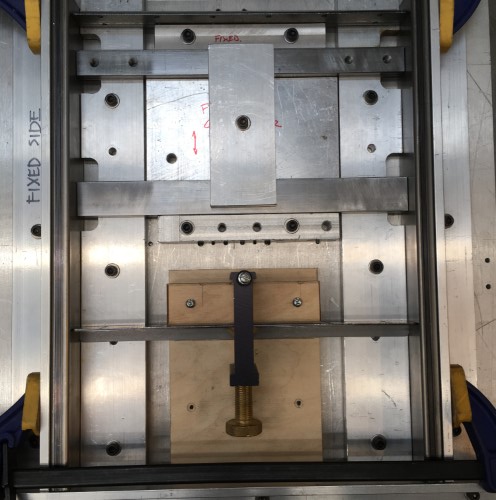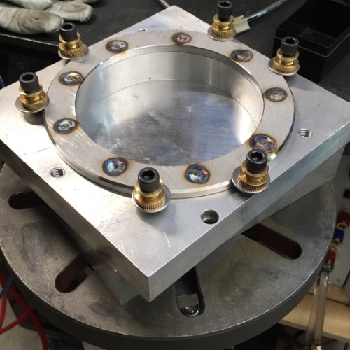 Finally, the screw is tightened with the giant handle (with a thrust bearing to manage the considerable load) and forces everything down onto the aluminum heatsink in order to draw away the distortion-inducing heat as quickly as possible after the completion of the weld.