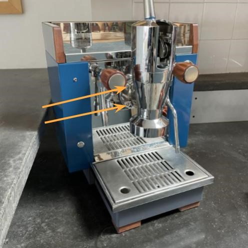 - Loosen the screws further until you can tilt the group upwards slightly to allow the water to escape.