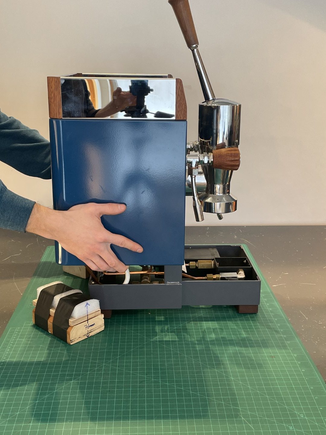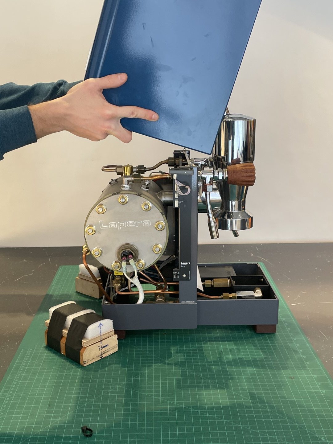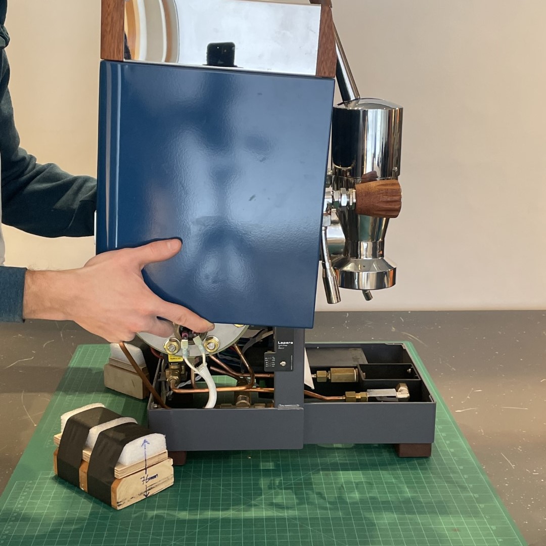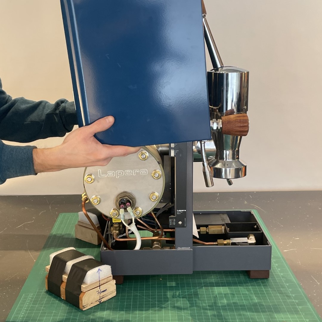 The bottom flange at the back of the case must clear the plumbing assembly on the back of the boiler. There is very little clearance here, so make sure the case is pulled all the way back on the frame.